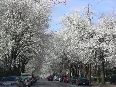 The Basilica is located in the oldest intact Victorian neighborhood in the U.S. This is the view coming up the street one over from us this afternoon: It looks like snow but it's really Bradford Pear trees lining the streets. This happens in one day. You drive up the street and the trees are bare. The next day it looks like this. Amazing.